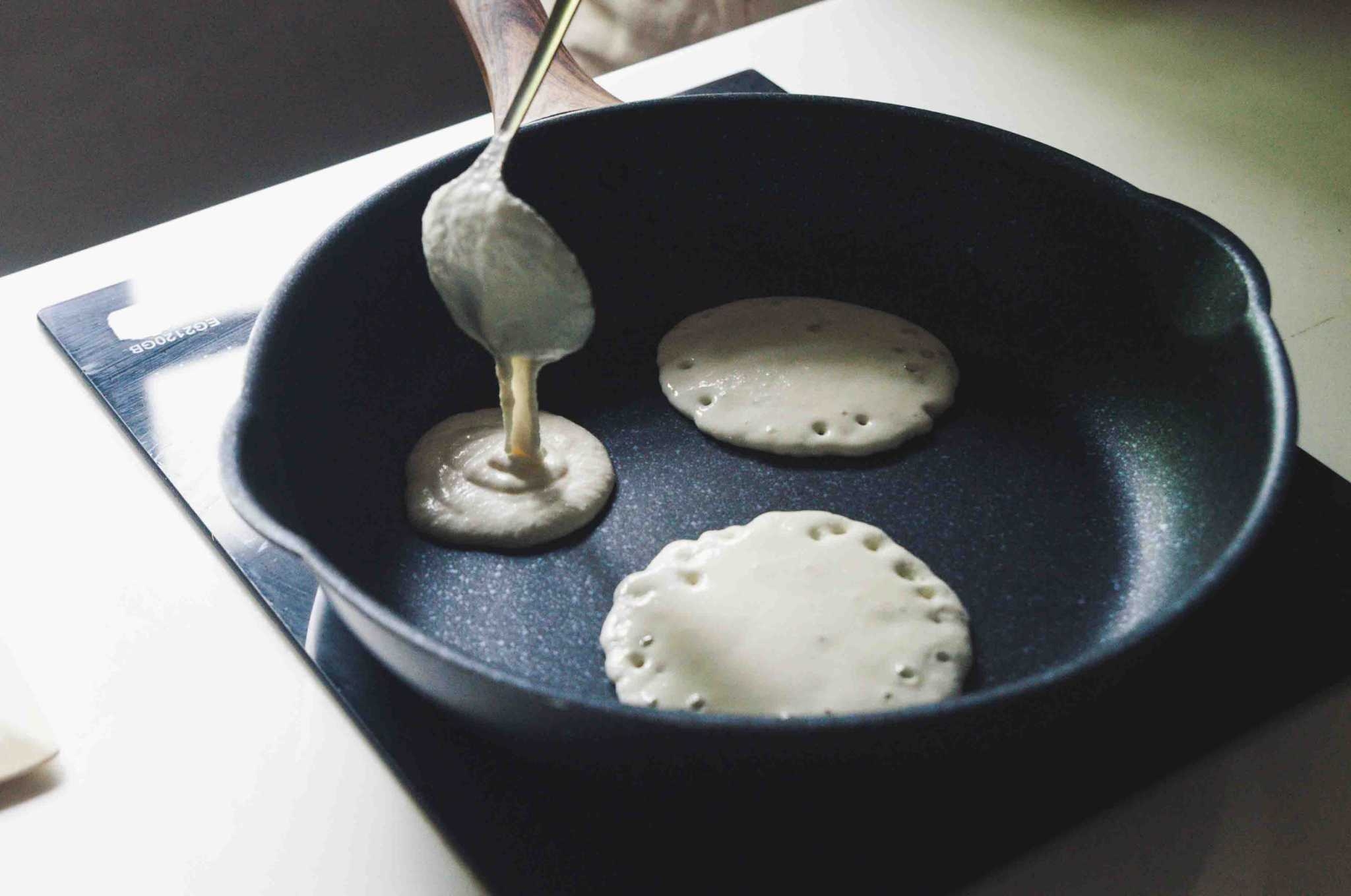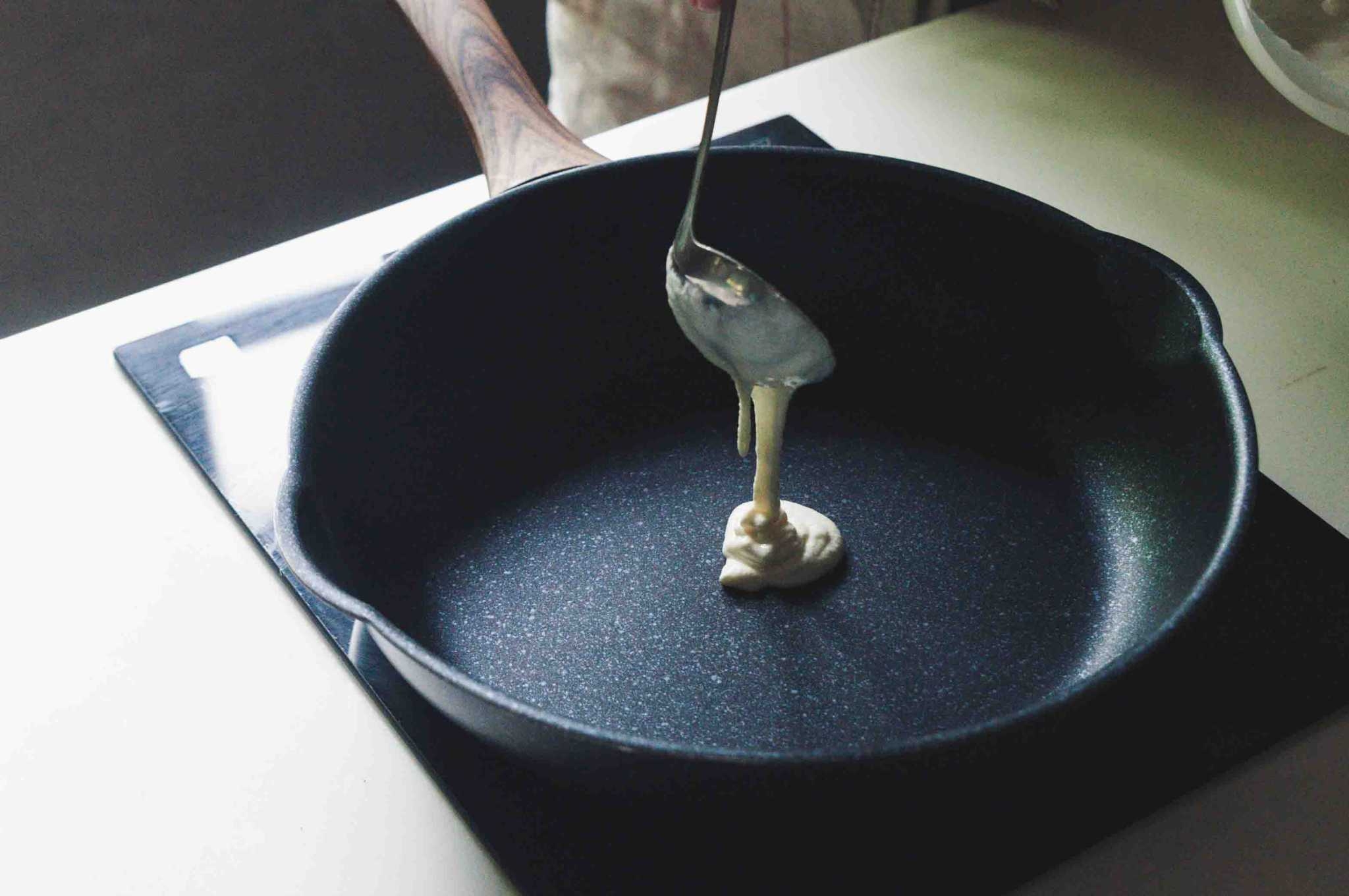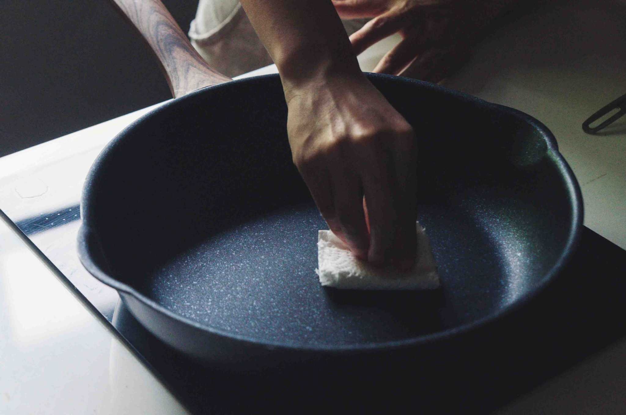 準備煎米鬆餅了,先將鐵鍋熱鍋或不沾鍋加入一些些油用餐巾紙抹勻