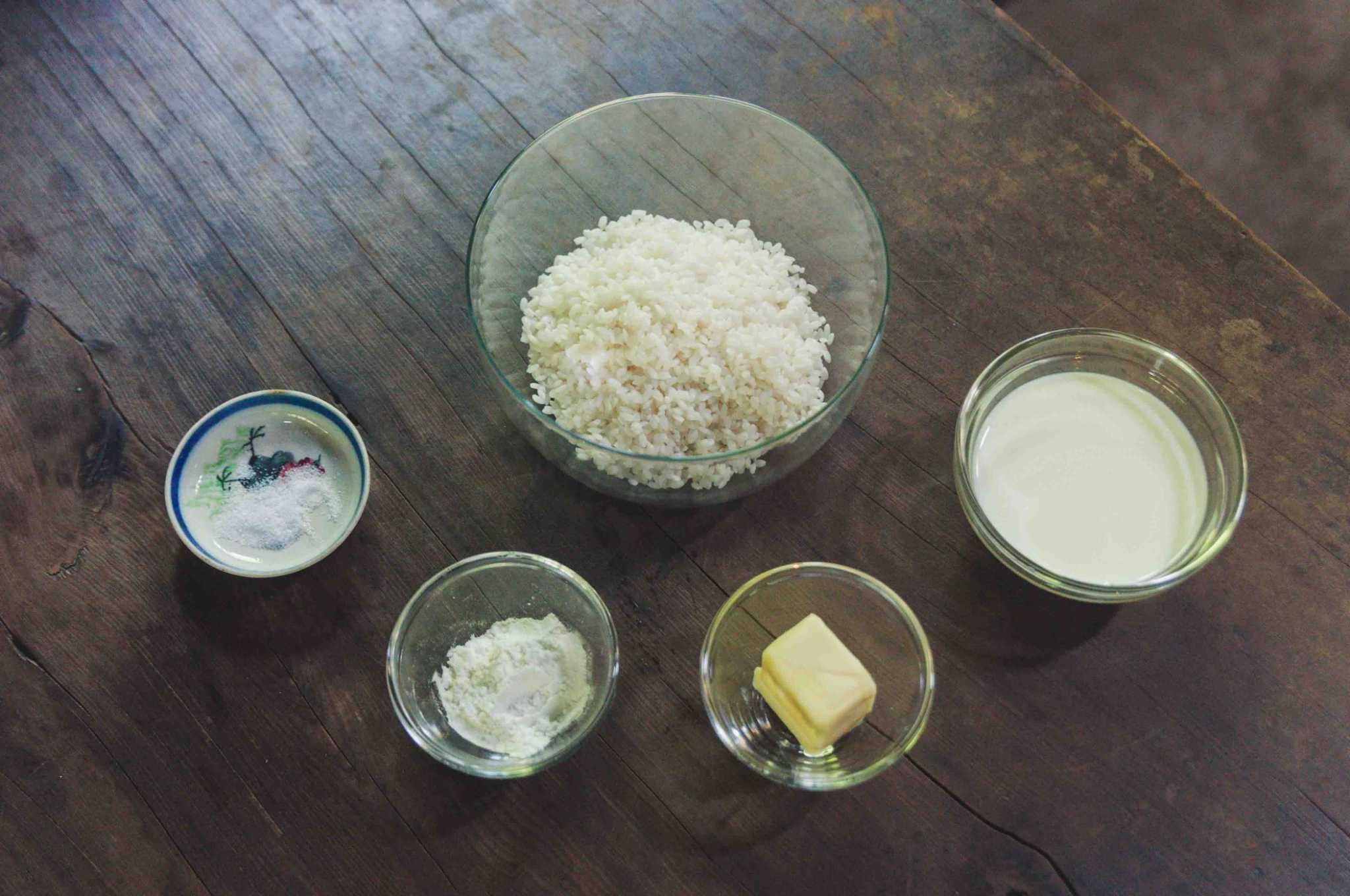 將米瀝乾水分後,與待會會使用到的食材,鮮奶、奶油、椰子花蜜糖、泡打粉都先備妥。