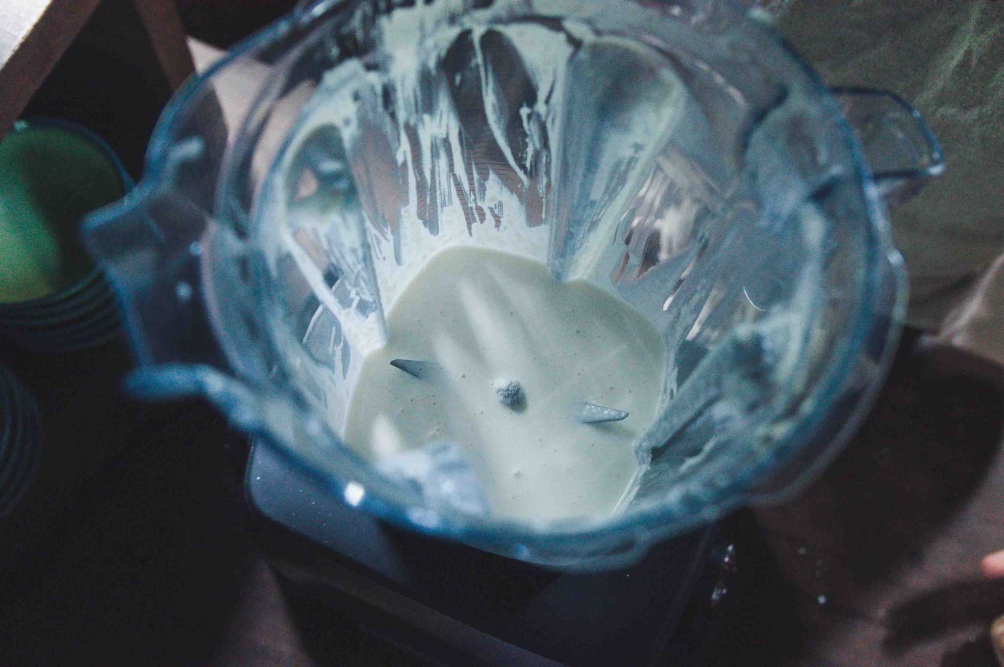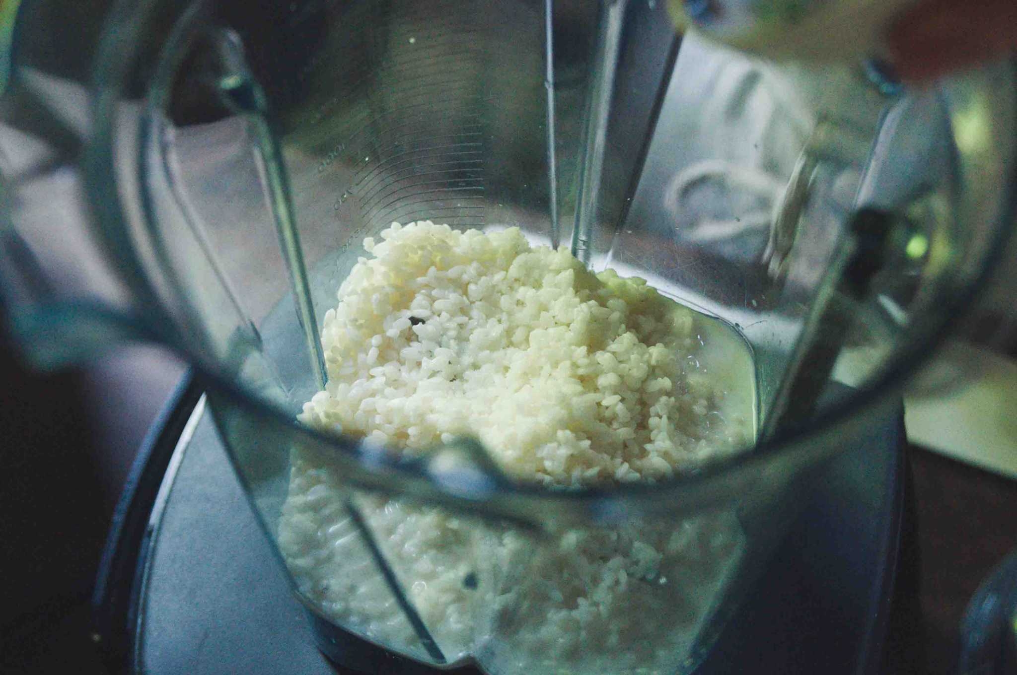 將瀝乾的米放入Vitamix,加入100的鮮奶、30g的椰子花蜜糖,用高速約1分鐘打成摸起來細緻無顆粒的米漿。