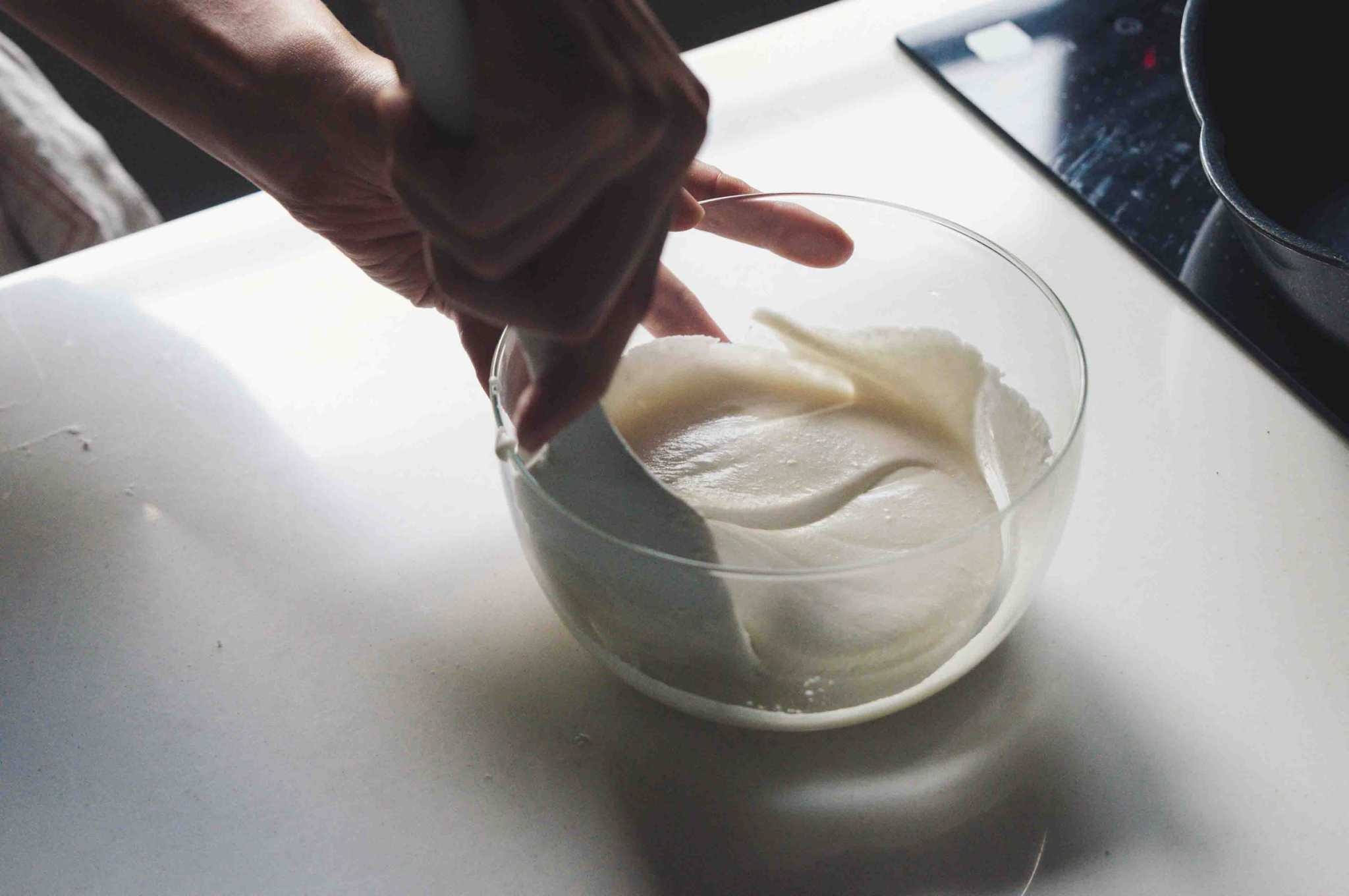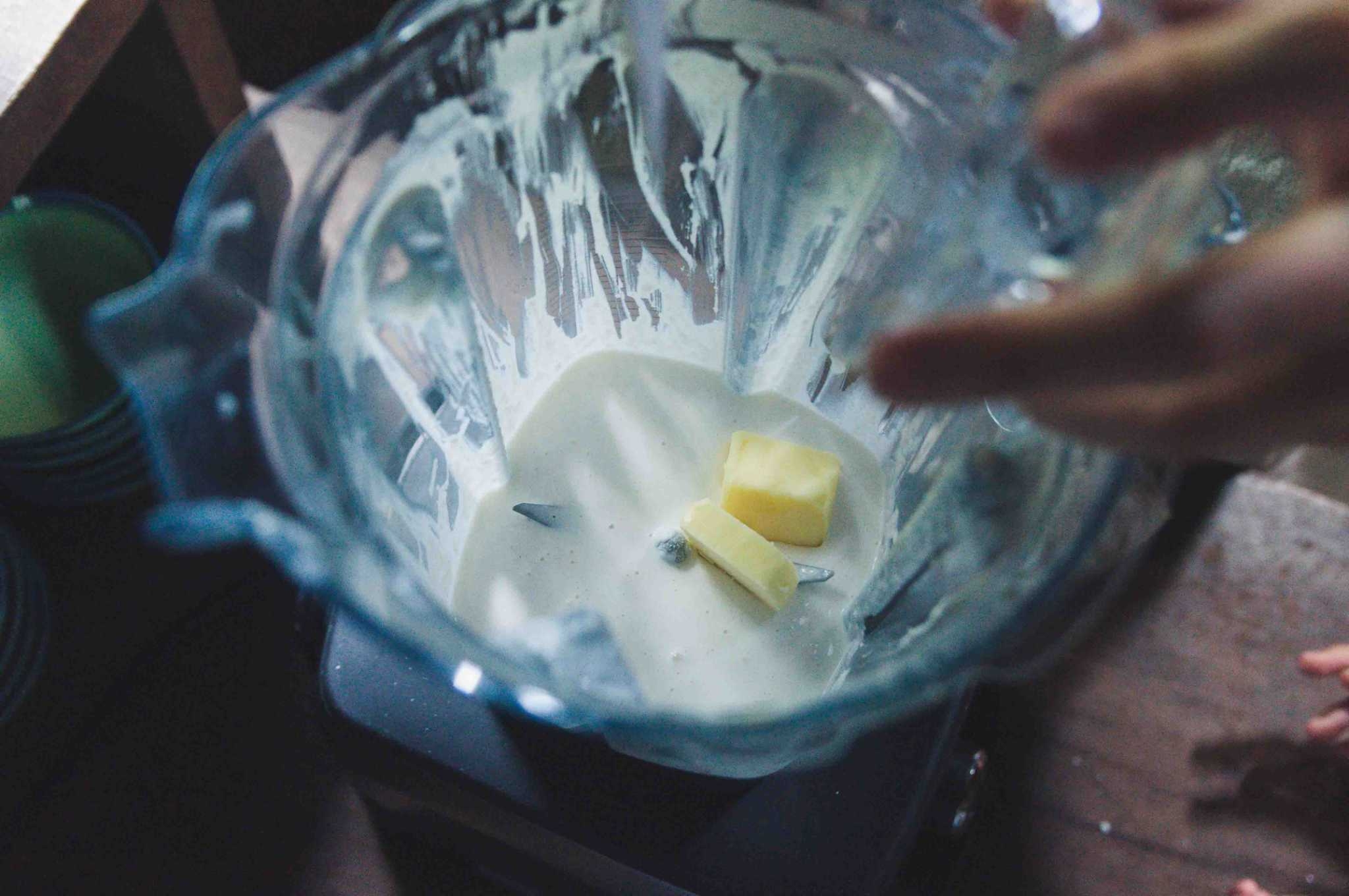 加入30g的奶油,這裡使用的是有鹽奶油,使用無鹽奶油可以加一小撮的鹽下去,使用低速將奶油和米漿乳化。